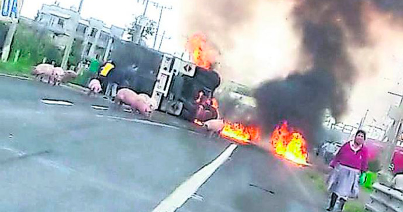 Por exceso de velocidad el tráiler volcó y uno de los tanques de diesel se abrió que fue lo que causo el incendio, el chofer se encuentra herido