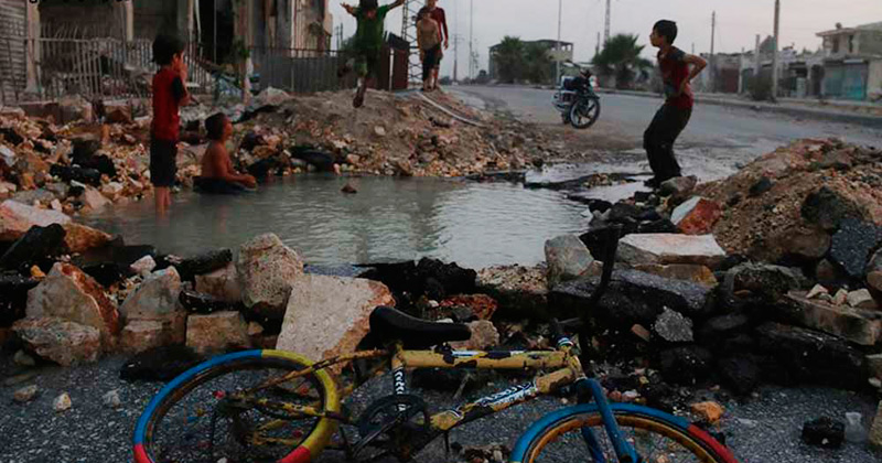 Niños en Siria utilizan cráter que dejó una bomba como piscina