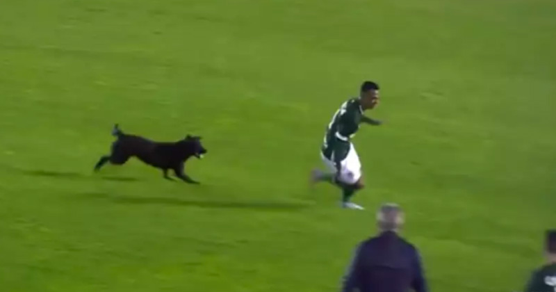 Perro entra a cancha de fútbol e intenta morder a un jugador (Video)