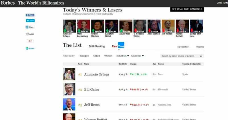 En tiempo real, la medicion de Forbes puso a Amancio Ortega, dueño de las tiendas Zara, en el primer sitio de los más ricos del mundo superando a la del fundador de Microsoft
