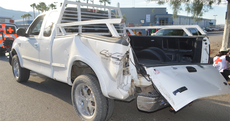 Chofer de un camión repartidor de viveres no alcanza a frenar y pega contra una camioneta. Ante el golpe el sale lesionado.