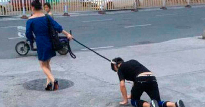 En Fuzhou, China fue captada la mujer caminando con el hombre encadenado lo que causo polémica e indignación en redes