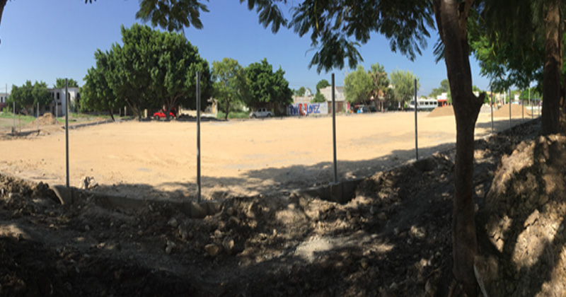 La cancha será de pasto natural y al momento se aprecia que el espacio que ocupará ya se encuentra debidamente asentado, limitado por muros de contención y piezas tubulares que servirán para la colocación de malla protectora.