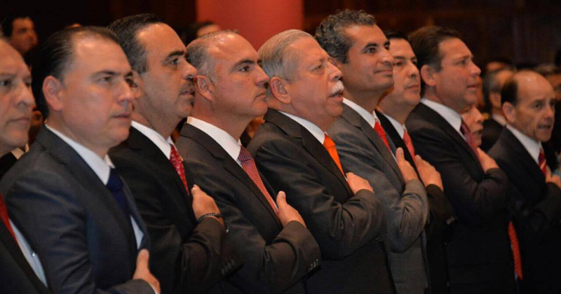 En el recinto se encuentran Gobernadores, Senadores, Diputados Federales, Locales, Presidentes Municipales, y Funcionarios de los diversos órdenes de Gobierno.