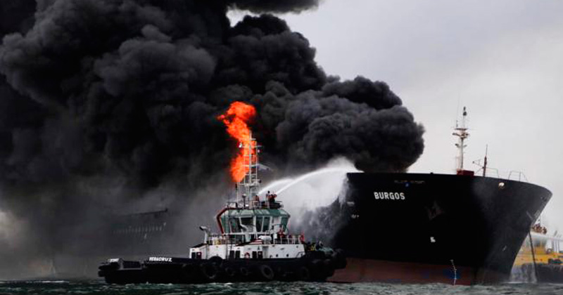 El accidente que ocurrido el sábado a 7 millas náuticas, sigue sin ser controlado ni extinguido, por lo que los 167 mil barriles de combustible que transportaba la embarcación son consumidos por el fuego