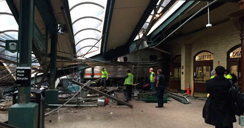 Fotos del lugar muestran a un tren de New Jersey Transit dentro de la estación, rodeado por escombros