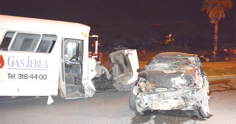 Conductor sufre lesiones de consideración al estrellarse atrás de un camión de pasaje de personal. El carro que tripulaba quedó abajo