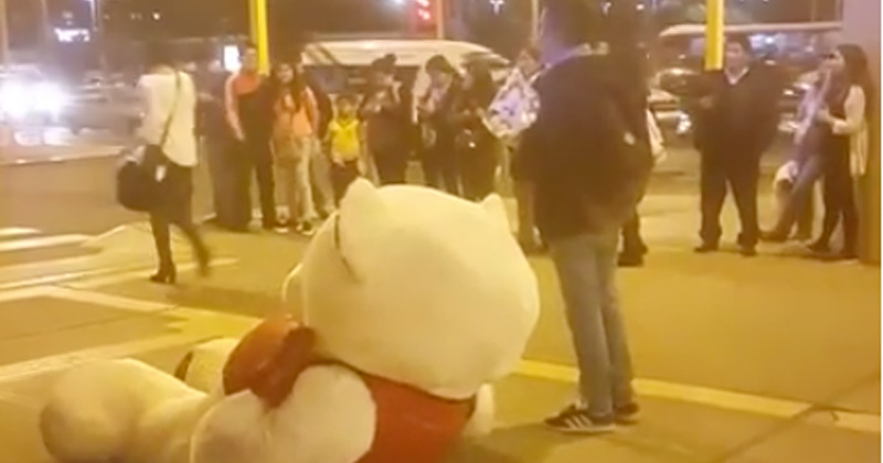 En las imágenes, se observa al joven parado al lado de un enorme oso de peluche con un ramo de flores en las manos esperando a la mujer que le robó el corazón, desafortunadamente, la chica no llegó a la cita.