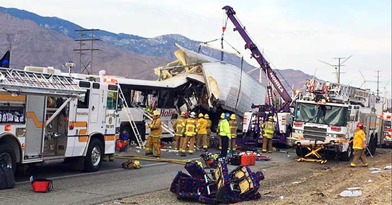 Un autobús de pasajeros choca contra un camión con remolque en la autopista Interestatal 10 en Desert Hot Springs