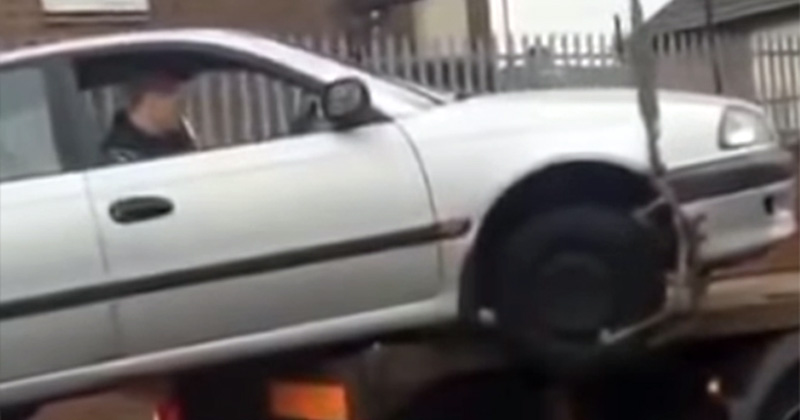 Intenta bajar su auto de la grúa pero nada sale bien (Video)