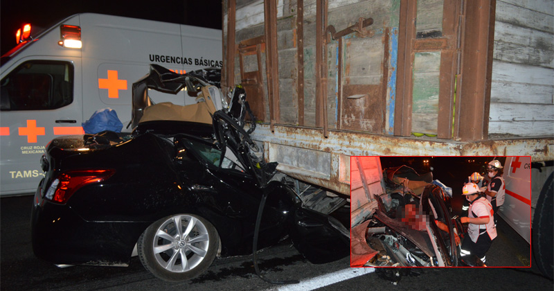Conductor de un sedán de modelo reciente queda atrapado abajo de un camión. Aparentemente el hombre perdió la distancia por ir leyendo el celular