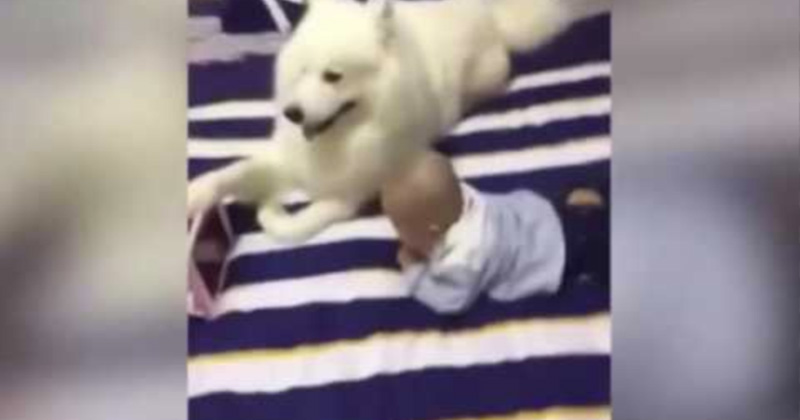 Perro sostiene una tablet para que un bebé vea las caricaturas (VIDEO)