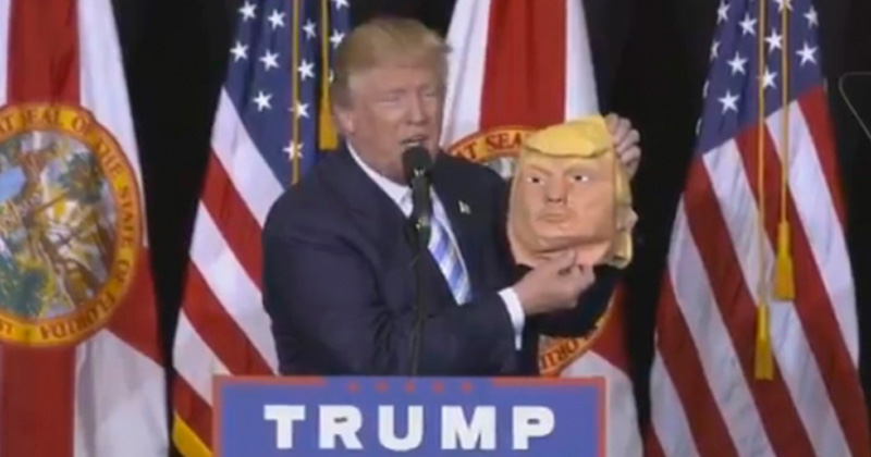 En el último día de campaña, Donald Trump admira su propia máscara (Video)