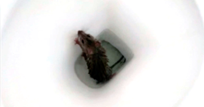 El roedor comienza a escalar la parte interna del escusado, aunque en un principio le cuesta trabajo por el agua