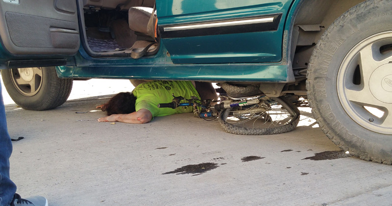 Señora viajaba en una bicicleta y una promotora la embiste, llevándosela abajo de su vehículo y arrastrándola por lo menos 12 metros. La víctima sufrió fracturas en cuerpo
