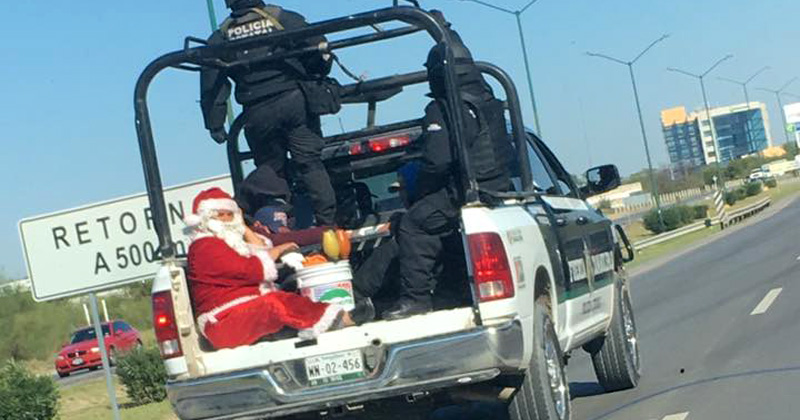 NUEVO LAREDO, Tamaulipas.- Esta tarde, un hombre vestido de Santa Claus era trasladado por elementos de Fuerza Tamaulipas en Nuevo Laredo.