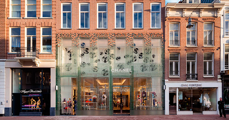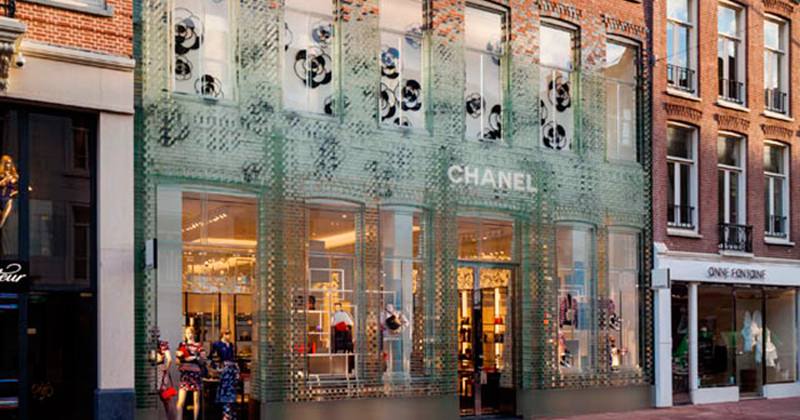 Sin embargo, una boutique de Chanel en Amsterdam ha hecho ningún compromiso cuando se volvieron la fachada del edificio en una pared de ladrillo de vidrio transparente.