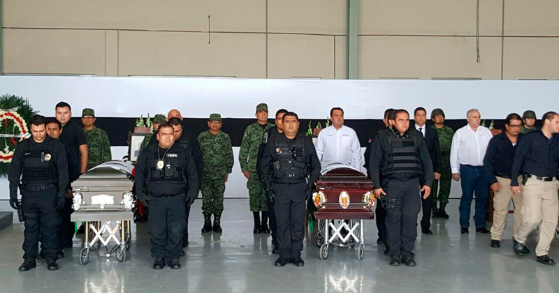 CIUDAD VICTORIA, Tamaulipas.- El gobernador del estado en compañía del gabinete de seguridad rindieron homenaje póstumo a los cuatro elementos de la Procuraduría General de Justicia a caídos en Nuevo Laredo.