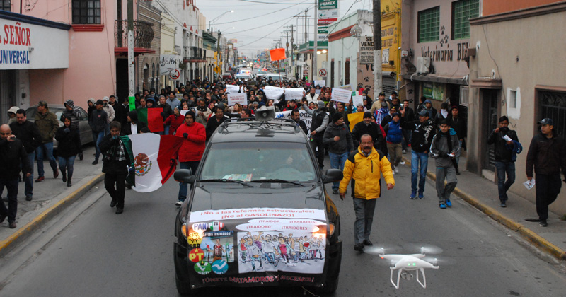 MATAMOROS, Tamaulipas.- Como estaba previsto, la marcha que se realizó aquí para protestar por el aumento a los precios de las gasolinas, se realizó de manera pacífica, sin embargo, en el acto se acordó bloquear puentes internacionales, esto, luego de escuchar, el próximo jueves otras propuestas como medida de presión para que se baje el costo de este combustible.