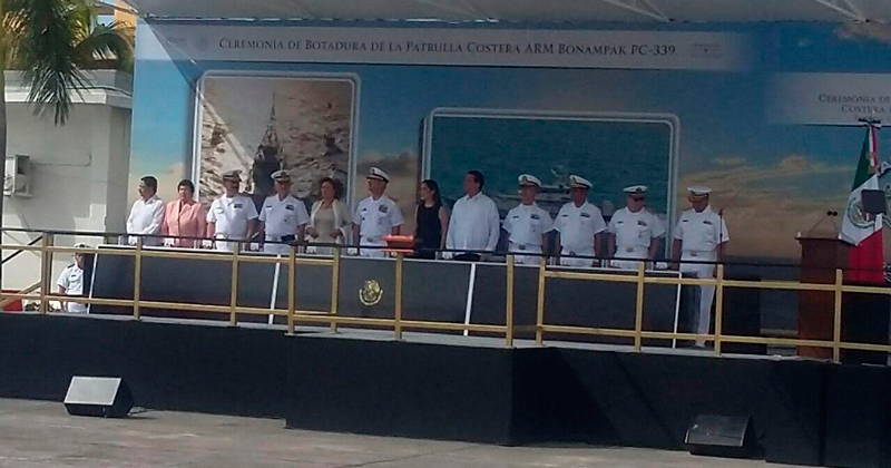 TAMPICO, Tamaulipas.- El secretario de Marina vicealmirante, Vidal Francisco Soberon Sanz, preside en estos en Tampico la ceremonia de botadura de la patrulla costera ARM Bonampak PC 339.