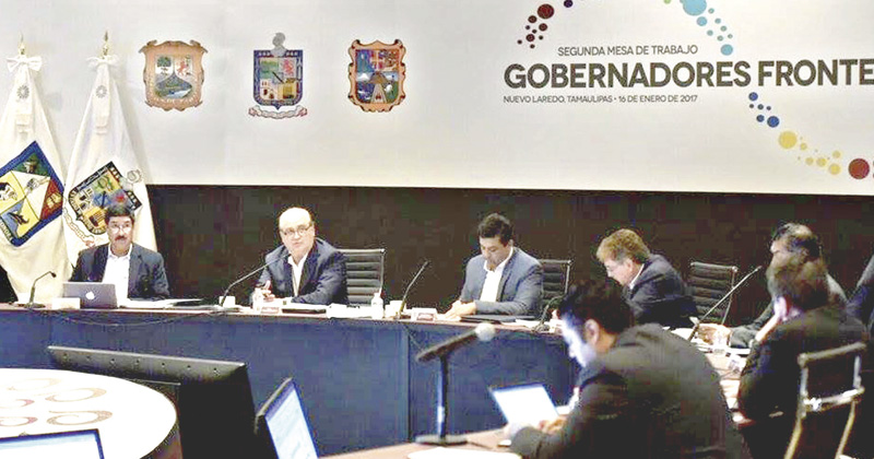 NUEVO LAREDO, Tamaulipas.- Al concluir la segunda mesa de trabajo, gobernadores fronterizos de la Conago acordaron una alianza para demandar al gobierno federal el apoyo para atender de manera inmediata temas como la migración, crimen organizado, seguridad, costos de energía eléctrica, salud y vivienda, entre otros.