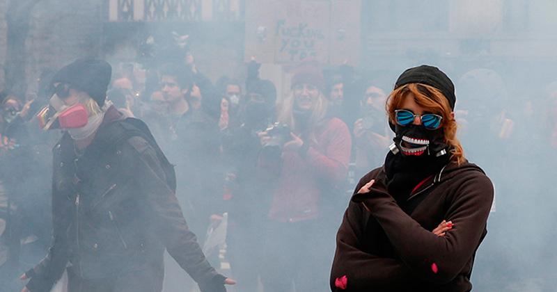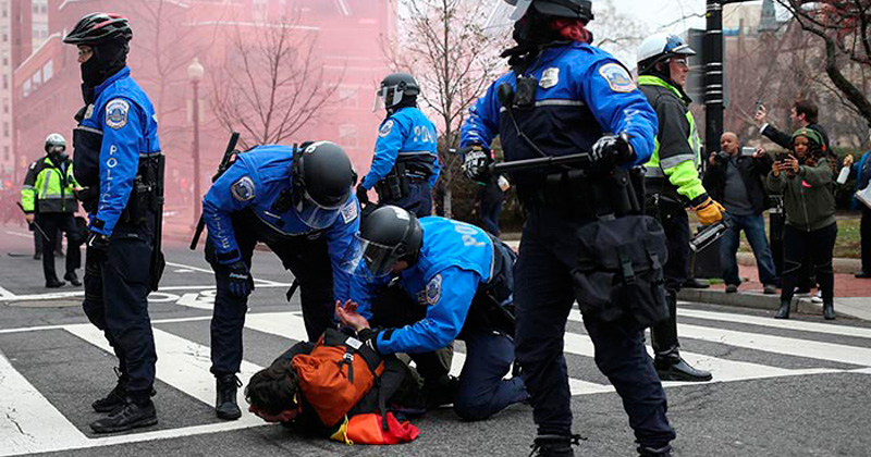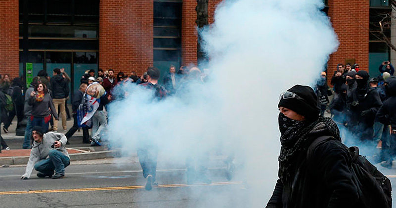 Poco después de que Trump jurara su cargo en el Capitolio, una de las manifestaciones que transcurría de manera pacífica y festiva desde Union Station a la plaza McPherson se desintegró cuando un grupo de anarquistas y antifascistas comenzaron a romper escaparates y a enfrentarse con la policía.