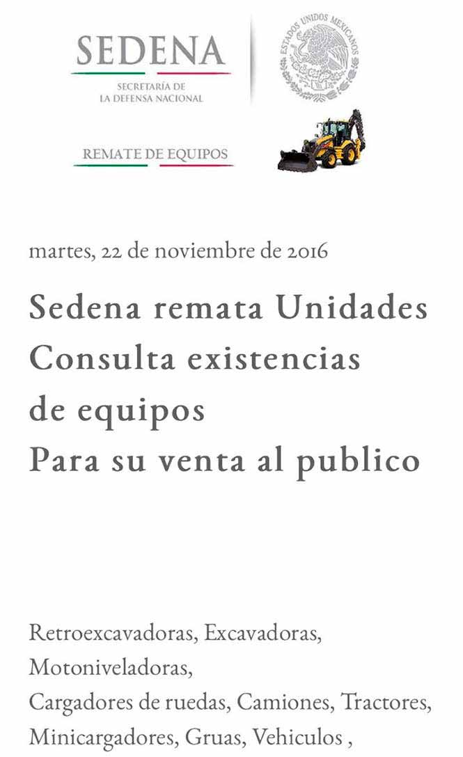 CIUDAD DE MÉXICO.- La Secretaría de la Defensa Nacional informa a la opinión pública que recientemente se detectó el sitio de internet apócrifo “http://www.sedena-gob.com/, en el cual se oferta la subasta de vehículos y maquinaria pesada, situación anormal, en virtud de que esta dependencia no realiza ventas por internet.