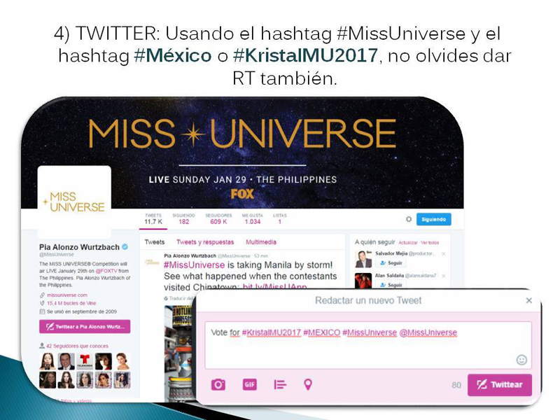 -Usando el Hashtag #MissUniverse en Twitter y el hashtag que identifica a la concursante.