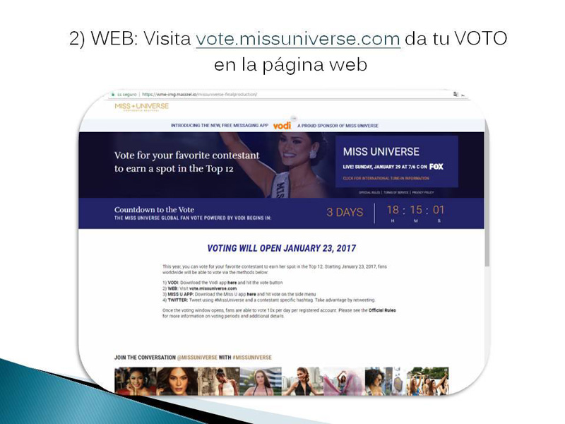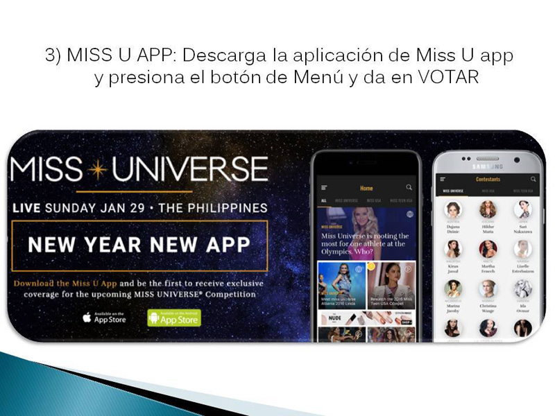 -Vodei: Pueden descargar la aplicación Vodi en el siguiente Link http://vodi.io/b/missuniverse y pulse el botón de votación.