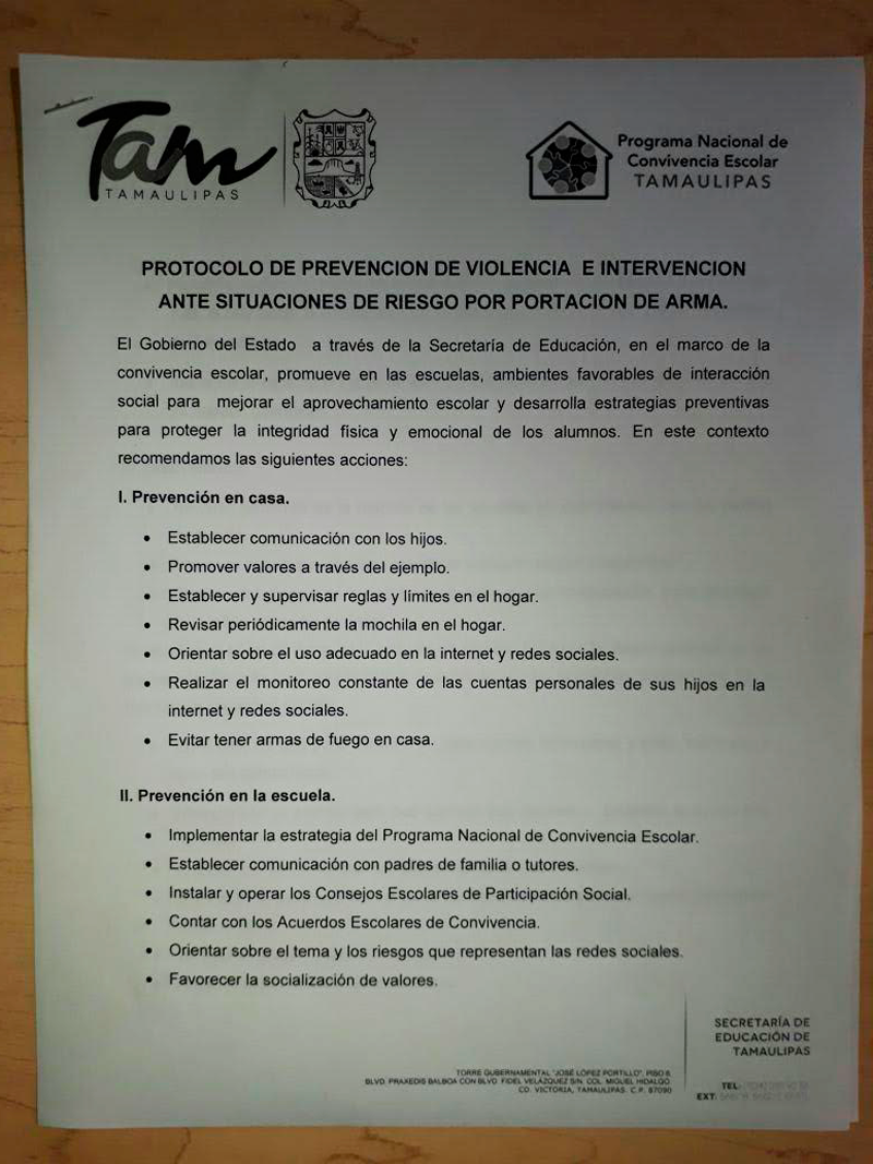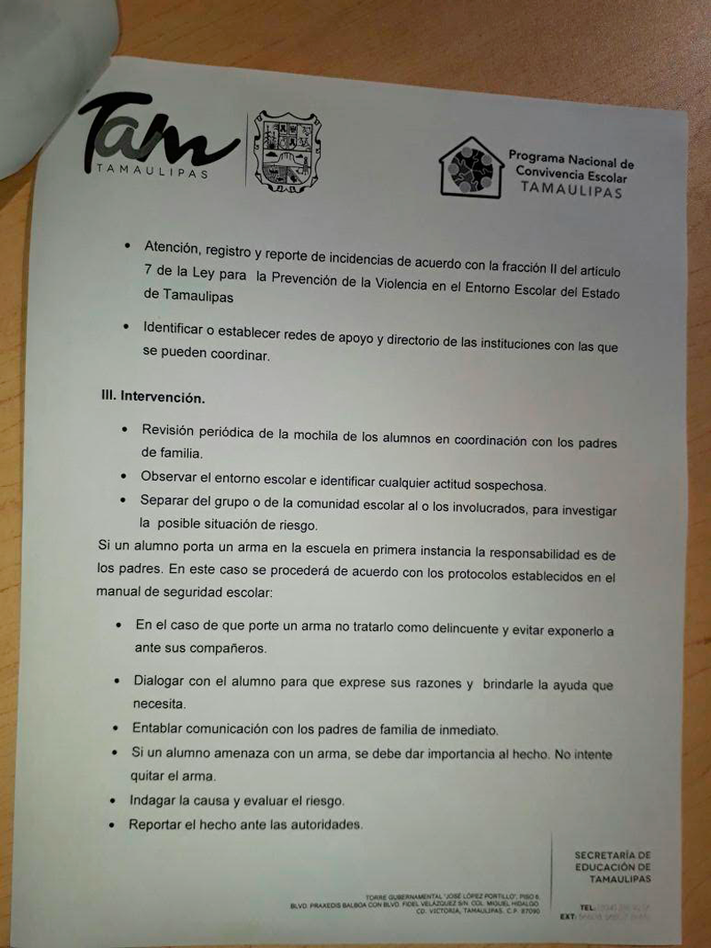 CIUDAD VICTORIA, Tamaulipas.- La Secretaría de Educación de Tamaulipas emitió el Protocolo de Prevención de la Violencia e Intervención ante Situaciones de Riesgo por Portación de Arma, en el que recomienda la ‘operación mochila’.
