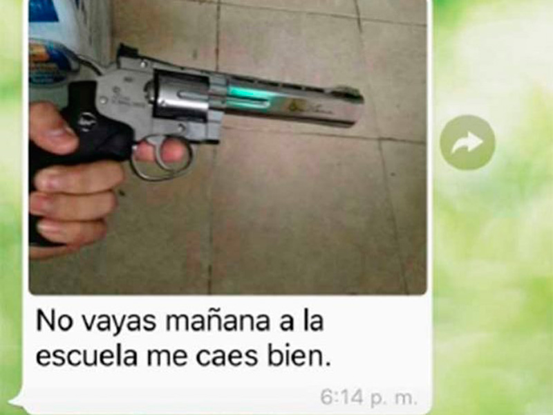 “No vayas mañana a la escuela me caes bien (sic)”, escribió el joven, junto a una fotografía en la que observa una mano sosteniendo un revólver.