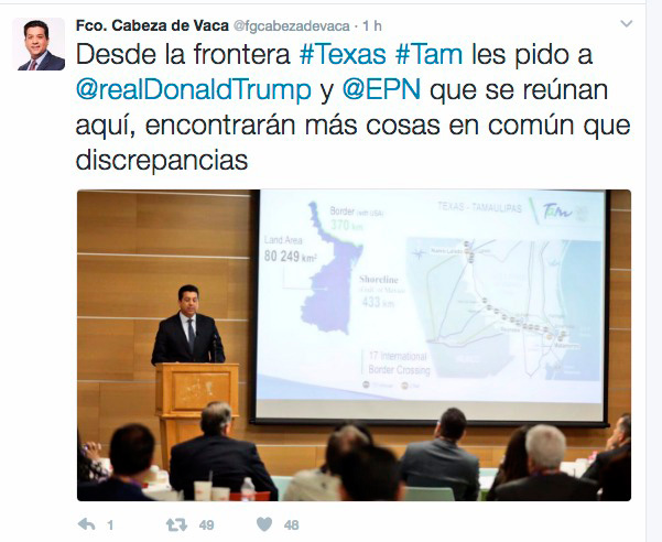 El mandatario tamaulipeco publicó en su cuenta oficial de Twitter: “Desde la frontera #Texas #Tam les pido a @realDonaldTrump y @EPN que se reúnan aquí, encontrarán más cosas en común que discrepancias”.