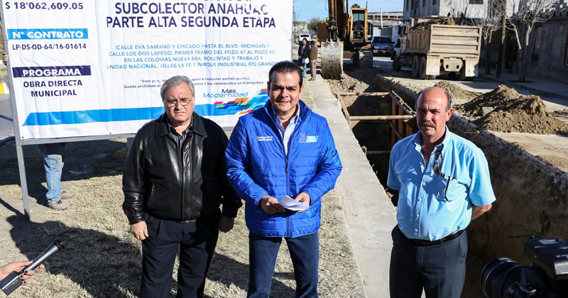 Al colector Anáhuac se le invierten 18 millones 062 mil 609 pesos y se tiene considerado el cambio de mil 237 metros lineales de tubería de pvc y concreto en beneficio de 33 mil 949 habitantes de 11 colonias del sector, entre ellas, La Fe, Villa La Fe, Nueva Era, Américo Villarreal, entre otras.