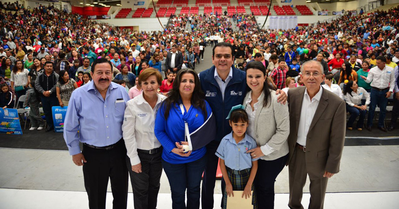 NUEVO LAREDO, Tamaulipas.- El presidente municipal Enrique Rivas, acompañado de funcionarios municipales y del Jefe del Centro Regional de Desarrollo Educativo (CREDE), Aurelio Uvalle Gallardo, entregó más de 5 mil tarjetas bancarias a niños y jóvenes beneficiados con becas municipales especiales y de excelencia en el Polyforum La Fe.
