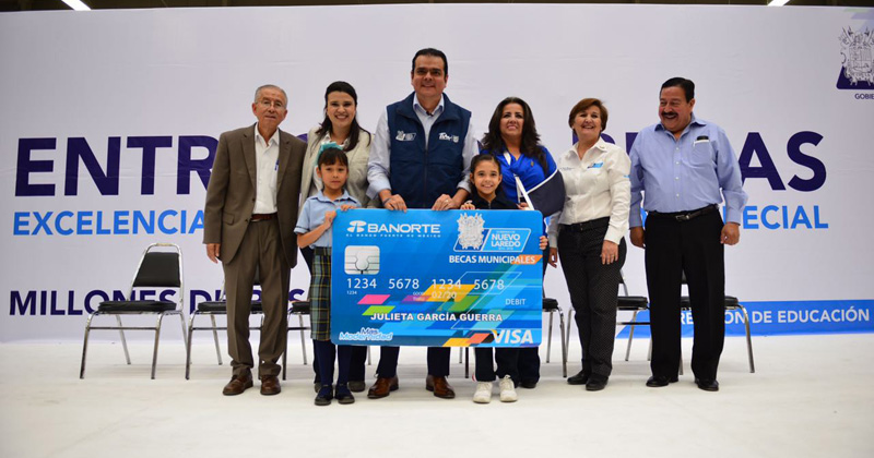 NUEVO LAREDO, Tamaulipas.- El presidente municipal Enrique Rivas, acompañado de funcionarios municipales y del Jefe del Centro Regional de Desarrollo Educativo (CREDE), Aurelio Uvalle Gallardo, entregó más de 5 mil tarjetas bancarias a niños y jóvenes beneficiados con becas municipales especiales y de excelencia en el Polyforum La Fe.