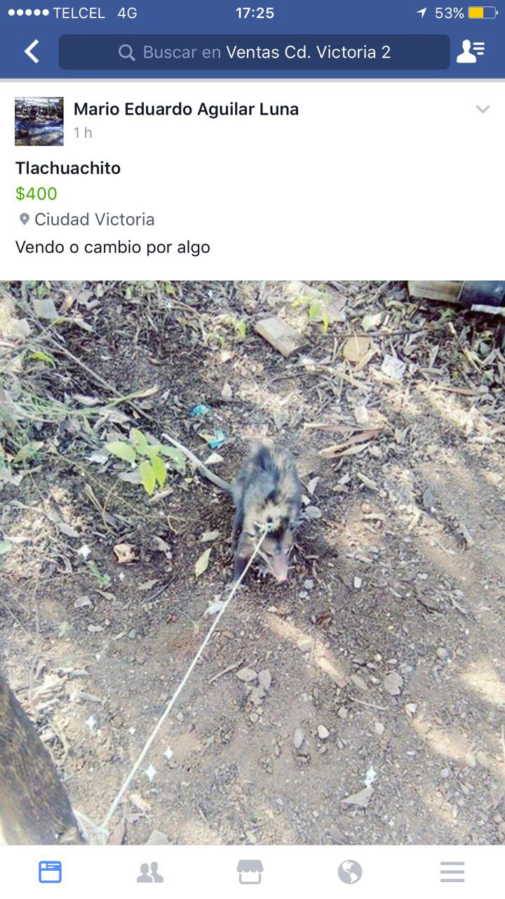 CIUDAD VICTORIA, Tamaulipas.- Un usuario en redes ofrece un tlacuache en el grupo Ventas Cd. Victoria 2 en una clara muestra de maltrato animal.