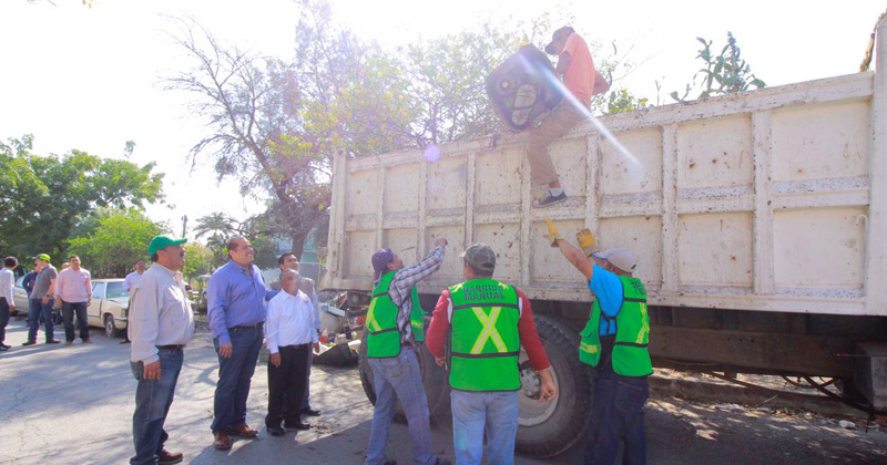 CIUDAD VICTORIA, Tamaulipas.- Este domingo el Alcalde Óscar Almaraz Smer, puso en marcha el programa de descacharrización, esquema que forma parte del nuevo modelo de recolección de basura. En la Unidad Habitacional Fovissste, al norte de la Capital, se recopilaron más de 25 toneladas entre llantas, electrónicos, sanitarios, colchones, alambre, madera, ramas, plásticos y otros artículos.