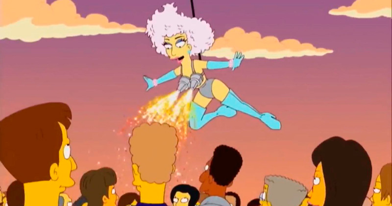 Además, curiosamente en uno de sus capítulos, la serie de dibujos animados amarillos a Lady Gagabajando del techo de su concierto tal y como lo hizo en el show del medio tiempo del Super Bowl.