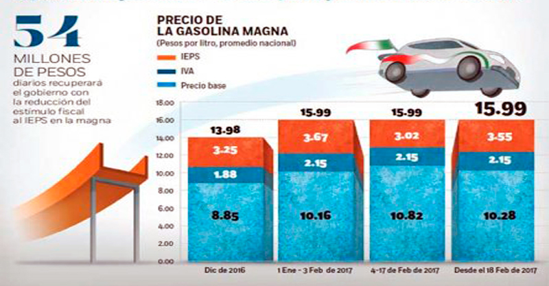 Excélsior calculó que de bajar el estímulo del IEPS de 1.77 pesos a 1.24 pesos a partir del sábado 18 de febrero como lo infiere Finamex, el gobierno federal obtendría una recaudación adicional de 54 millones de pesos diarios respecto a lo que recaudó por día entre el 4 y el 17 de febrero.