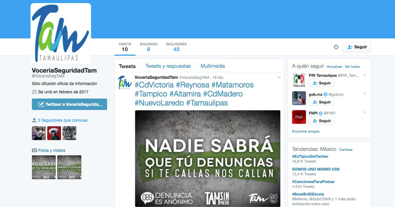 CIUDAD VICTORIA, Tamaulipas.- La vocería de seguridad en Tamaulipas, habilitó un Twitter para dar a conocer las acciones que en materia de seguridad se están haciendo y promoverá además la cultura de la denuncia.