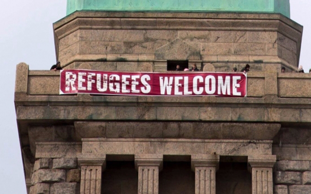 Colocan en Estatua de la Libertad cartel: «bienvenidos refugiados»