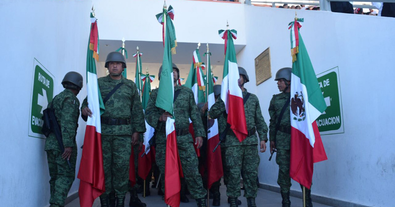 CIUDAD VICTORIA, Tamaulipas.- La ceremonia de abanderamiento a escoltas de instituciones y planteles educativos, organizado por el Ejército Mexicano en el Día de la Bandera de México, sirvió para llamar a la unidad en el país y enfrentar las adversidades internacionales por las que están atravesando.
