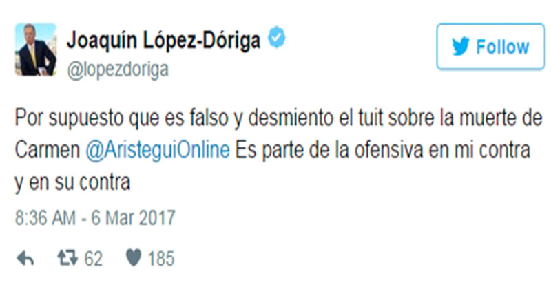 Mediante una publicación en su cuenta de Twitter, Joaquín López Dóriga desmintió que haya publicado del día de ayer un tuit en el que informaba la supuesta muerte de la periodista Carmen Aristegui.