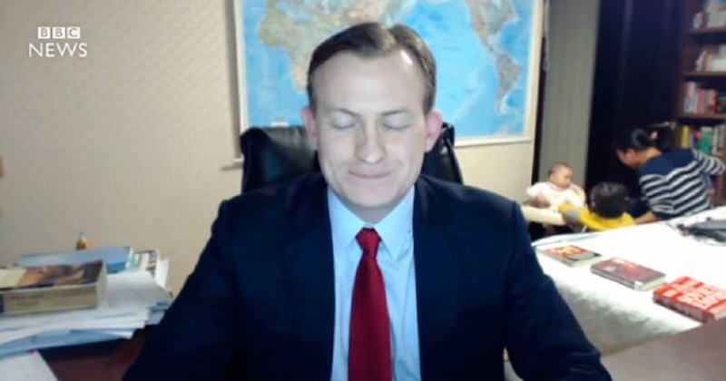 Él abordaba la tensión política que se vive en Corea del Sur cuando sus dos pequeños hijos aparecieron para interrumpirlo. La seriedad del tema que tocaba quedó en segundo plano por esta situación anecdótica.