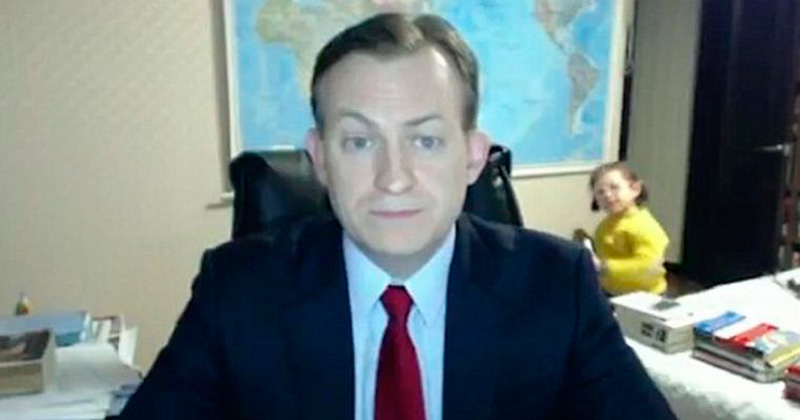 Robert Kelly, especialista en Corea del Sur, se encontraba en una entrevista en vivo con la BBC sobre las implicaciones de la salida de la presidenta del país asiático, cuando su hija de cuatro años y su bebé de ocho meses interrumpieron la escena.