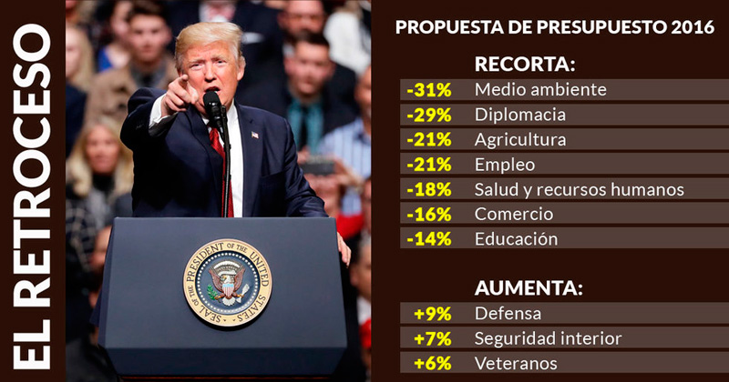 La propuesta presupuestaria, revelada hoy, aplica enormes recortes en el Departamento de Estado (28 por ciento), la Agencia de Protección Medioambiental (EPA), de un 31 por ciento, el Departamento de Salud (23 por ciento) y en el de Trabajo (21 por ciento).