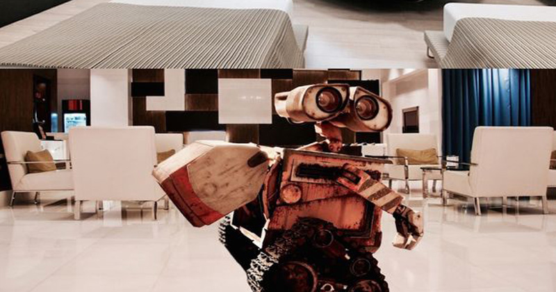 La decoración de las habitaciones es minimalista pero sorprenden las terminaciones para un establecimiento de bajo costo con un valor promedio por noche de 50 dólares. Debajo: un robot inspirado en WALL-“corre” a asistir a un huesped.