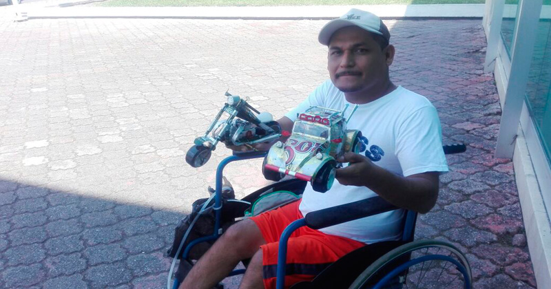 Hace cuatro años perdió la movilidad de sus piernas y sobrevive creando estos adornos