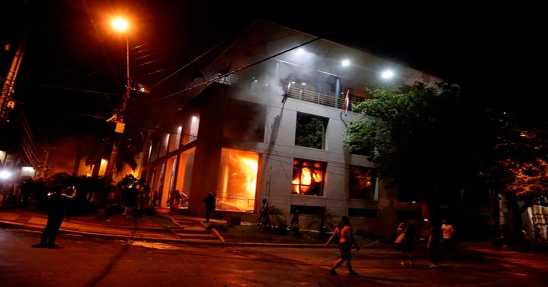 Los manifestantes destrozaron vidrieras del edificio, en el centro histórico de Asunción, y quemaron las puertas de entrada, además de lanzar petardos y piedras a la Policía. Algunos de quienes entraron al recinto se apoderaron de documentación que luego voltearon en el exterior.