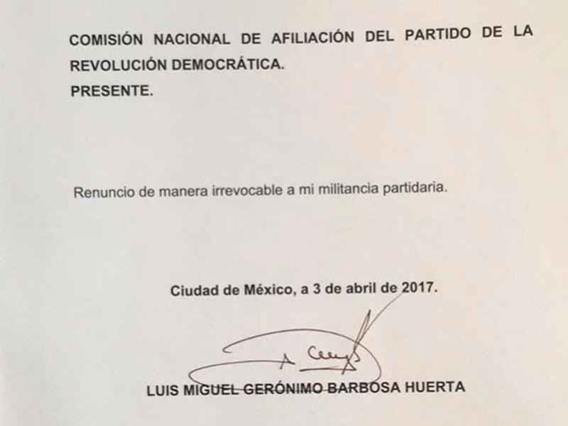Esta mañana presenté ante la Comisión Nacional de Afiliación del @PRDMexico mi renuncia irrevocable a mi militancia en este partido”, publicó el funcionario en su cuenta de twitter @MBarbosaMX.